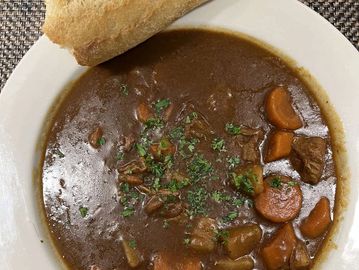 This thick flavorful gravy is filled with chunks of our hand cut tender sirloin, onions, carrots, celery & potatoes served with a big crunchy baguette