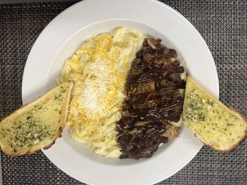 Seasoned slow roast pork topped with a house-made sauce, made to order mac & cheese served with garlic bread