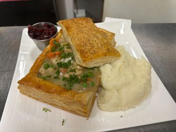 Traditional filling fills this puff pastry boat served with mashed potatoes and cranberry sauce