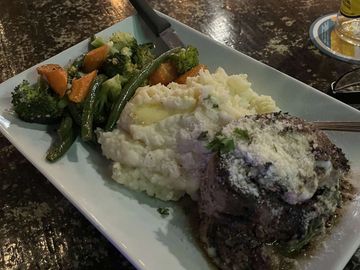 Spinach & cheese stuffed sirloin pinwheels served with mashed potatoes and vegetable medley